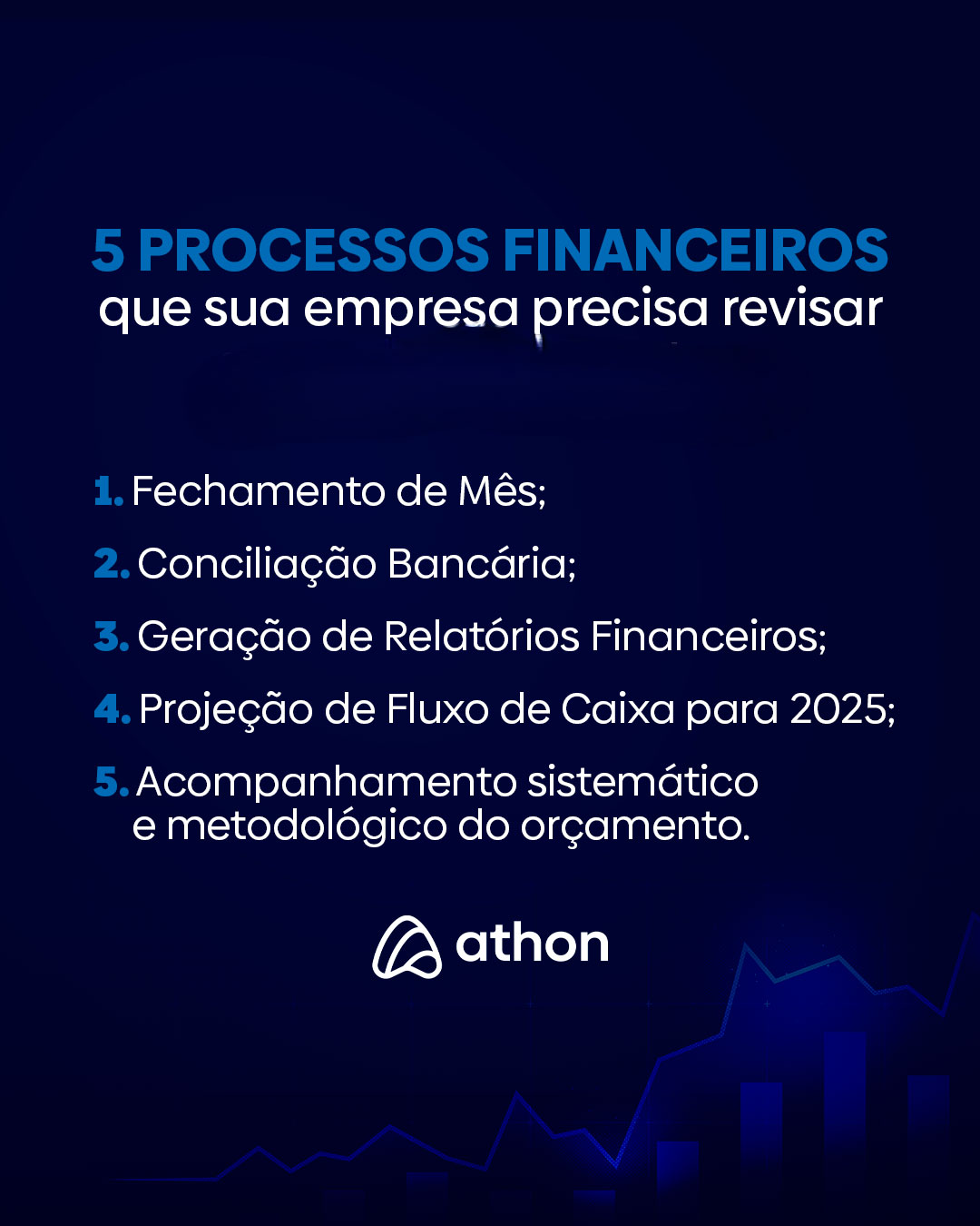 É hora de dar aquele check-up nas finanças da sua empresa para garantir que 2025 comece com o pé direito! 👟📊 Aqui estão 5 processos financeiros essenciais para revisar ou otimizar antes do novo ano:
